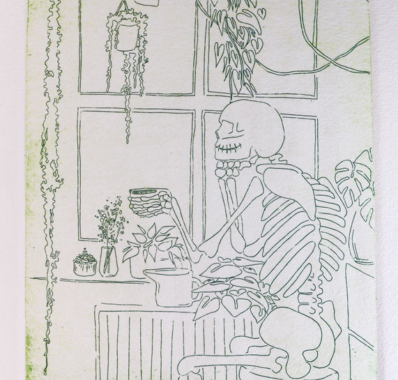 The process of creating this print is very different from the prints I have sold previously. While all my prints in the past have been wood block relief (carving the image and applying the ink on the top) this process involves prepping a copper plate, drawing the image into the copper, soaking the plate in an acid bath to etch the image into the plate, and an entirely different inking process that produces the image. THIS EDITION HAS BEEN GIVEN GLITTER/GOLD LEAF AS AN EMBELLISHMENT.
